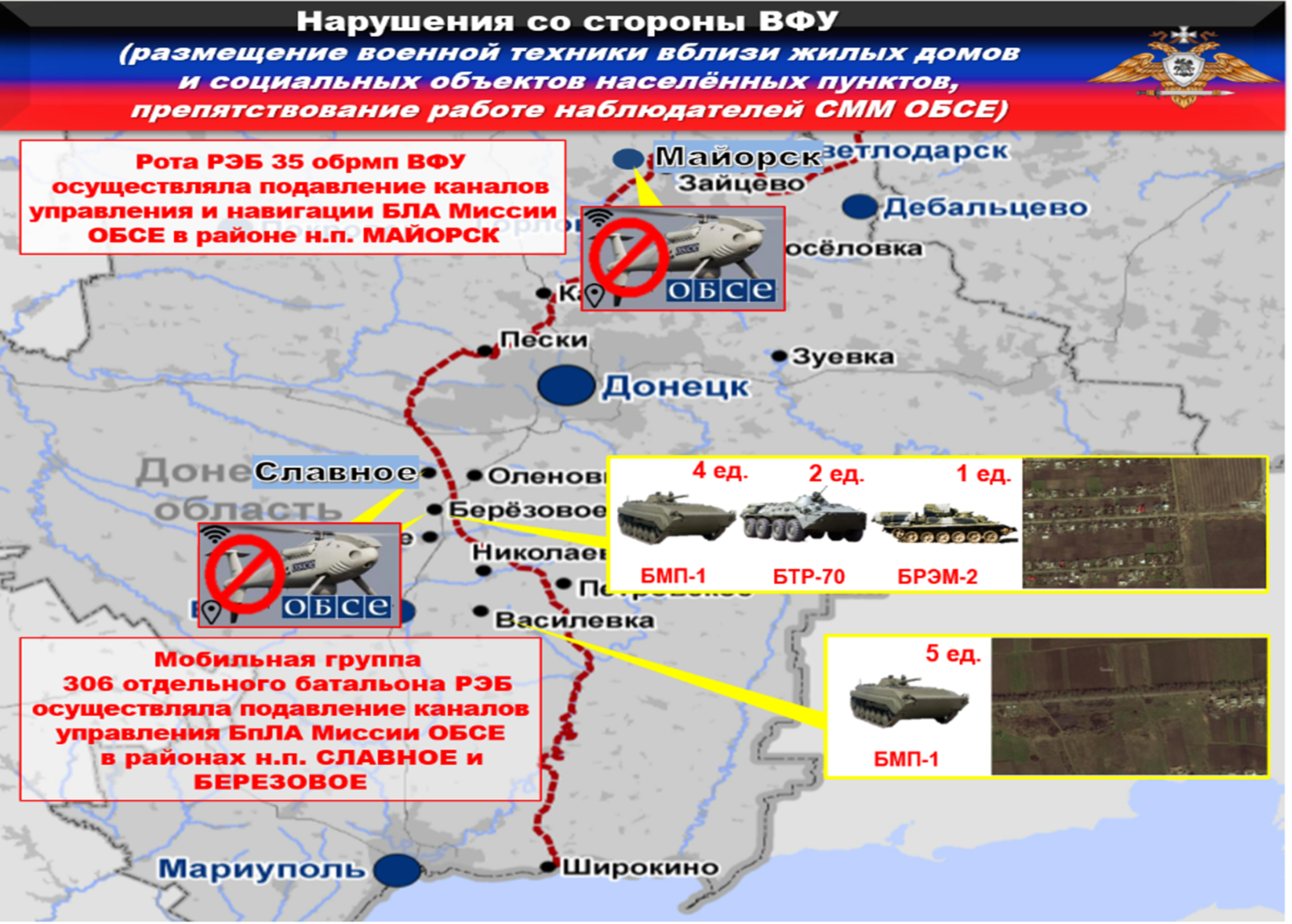 Украинская сторона продолжает препятствовать работе Международных наблюдателей. Так, с целью недопущения обнаружения беспилотниками СММ ОБСЕ запрещенного вооружения в зоне ответственности 35 обрмп, 28 омбр и 53 омбр ВФУ, зафиксирована работа мобильных групп роты РЭБ 35 омбр и 306 об РЭБ с задачей подавления станцией «Букавель-АД» каналов управления и навигации миссии ОБСЕ в районах н.п. МАЙОРСК, СЛАВНОЕ и БЕРЕЗОВОЕ.