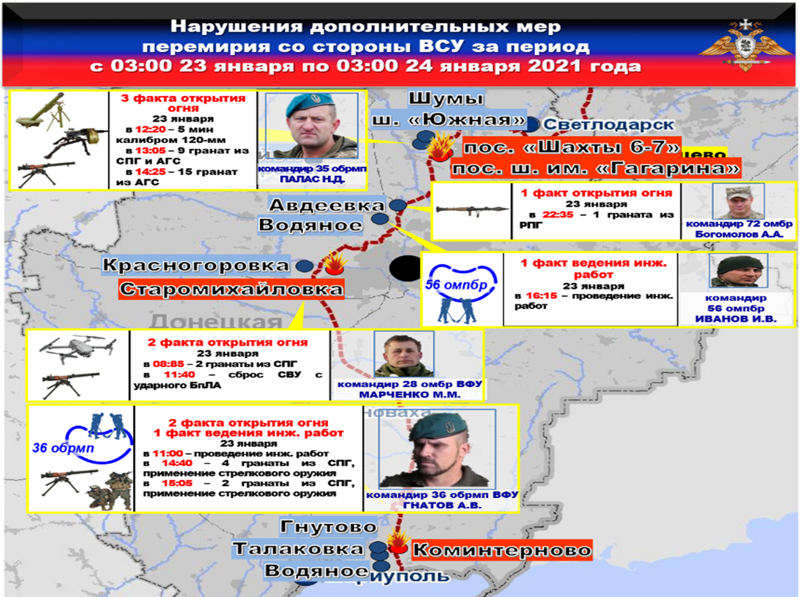 Факты нарушения в оперативном порядке доведены до представителей украинской стороны в СЦКК, с целью принятия мер к нарушителям и исключения случаев фальсификации учетных данных о нарушениях режима прекращения огня со стороны украинских боевиков.