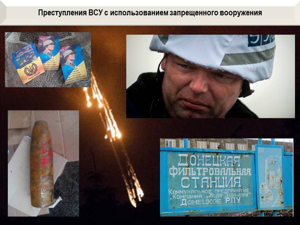 И в заключение, хотелось бы обратиться к международному сообществу в лице заместителя Главы СММ ОБСЕ А.Хуга. В настоящее время украинская сторона начала активно применять запрещенные Минскими соглашениями и международными конвенциями боеприпасы. Они наносят удары фосфорными боеприпасами по району ДФС, обстреливают 122-мм снарядами, начиненными шрапнелью, Мариупольское направление. А также распространяют листовки откровенного нацистского содержания, с угрозами убивать женщин и детей Донбасса, применяя артиллерийские агитационные боеприпасы.