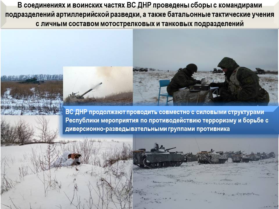 На прошедшей неделе в соединениях и воинских частях Вооруженных сил ДНР проведены сборы с командирами подразделений артиллерийской разведки, а также батальонные тактические учения с личным составом мотострелковых и танковых подразделений. Продолжалось проведение мероприятий, совместно с другими силовыми ведомствами Республики,