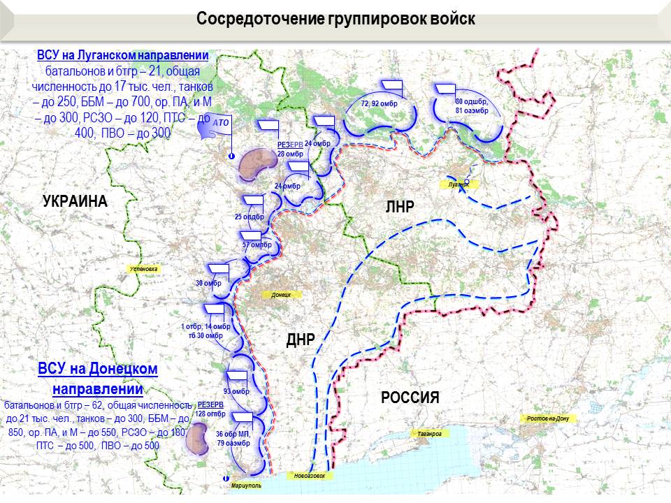 Планом противника предусматривается силами развернутых на линии боевого соприкосновения соединений и воинских частей, входящих в группировку сил АТО при поддержке артиллерии и авиации нанести максимальное поражение НМ ДНР и ЛНР, преодолеть полосу обеспечения и прорвать первый оборонительный рубеж в пределах опорных пунктов рот и районов обороны батальонов первого эшелона подразделений НМ ДНР и ЛНР, захватить выгодные рубежи. Массированным огнем артиллерии и огневых средств танковых и мотопехотных подразделений, десантно-штурмовых и артиллерийских подразделений по позициям НМ ДНР враг будет пытаться создать условия для ввода основных сил наступательной группировки ВСУ.