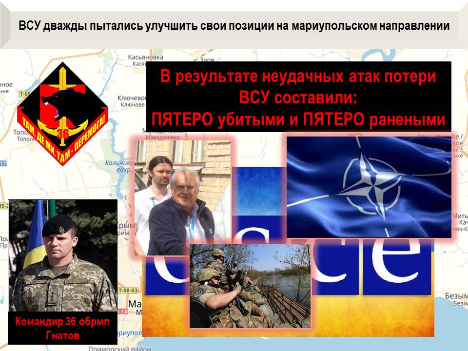 В результате двух вылазок на юге украинские горе-боевики потеряли, по уточненным данным, ПЯТЬ убитыми и ПЯТЬ раненными. Важно отметить, что потери оккупантов убитыми увеличились в результате минометного огня террористов по своим раненным, чтобы исключить возможность их пленения. Наша разведка отмечает, что расстрел раненных морпехов выполняли подразделения «Азова», из района Широкино.