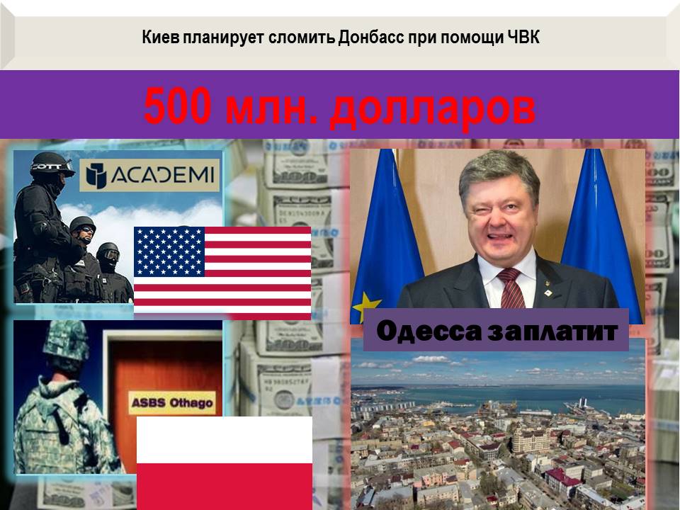 Украинское военно-политическое руководство не оставляет надежд на реванш, то есть на силовой путь возврата под свой контроль территорий Донбасса. Для этого, власти Украины в мае-июне 2018 г. провели тайные переговоры с руководством международных частных военных компаний, таких как «Academy» (США), «ASBS Othago» (Польша), на привлечение более ТЫСЯЧИ иностранных наемников. За свои услуги частные военные компании затребовали с правительства Украины около ПЯТИСОТ МИЛЛИОНОВ долларов.