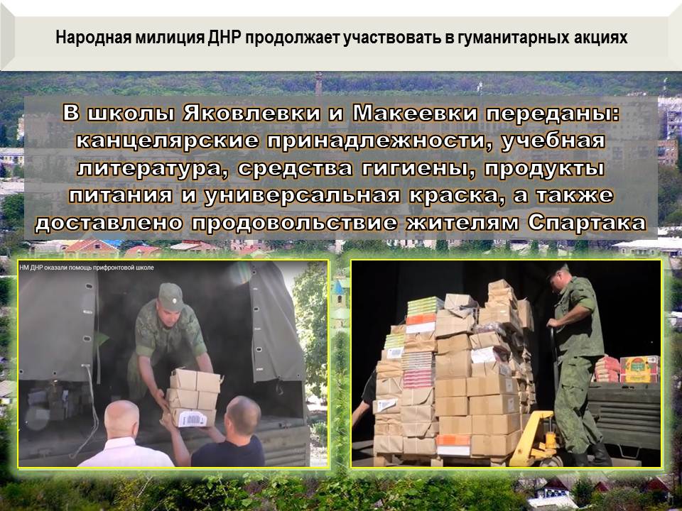 Народная милиция ДНР, совместно с благотворительными и общественными организациями, провела гуманитарные акции, по доставке средств гигиены, канцелярских принадлежностей, учебной литературы, продуктов питания и строительных материалов, школам населённых пунктов Яковлевка и Макеевка, а также продовольствия жителям населенного пункта Спартак.