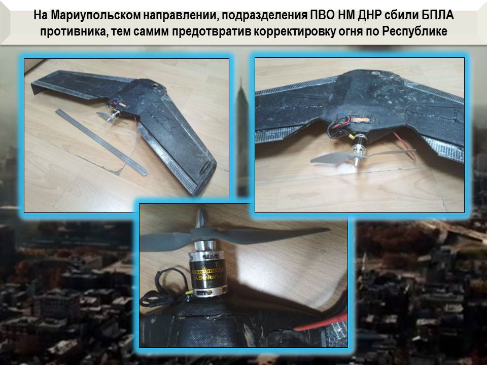 Враг пытался корректировать свой огонь по этим населенным пунктам с помощью беспилотника, однако уже на подлете к территории нашей Республики он был сбит подразделениями ПВО. Сегодня мы представляем его на нашем брифинге.