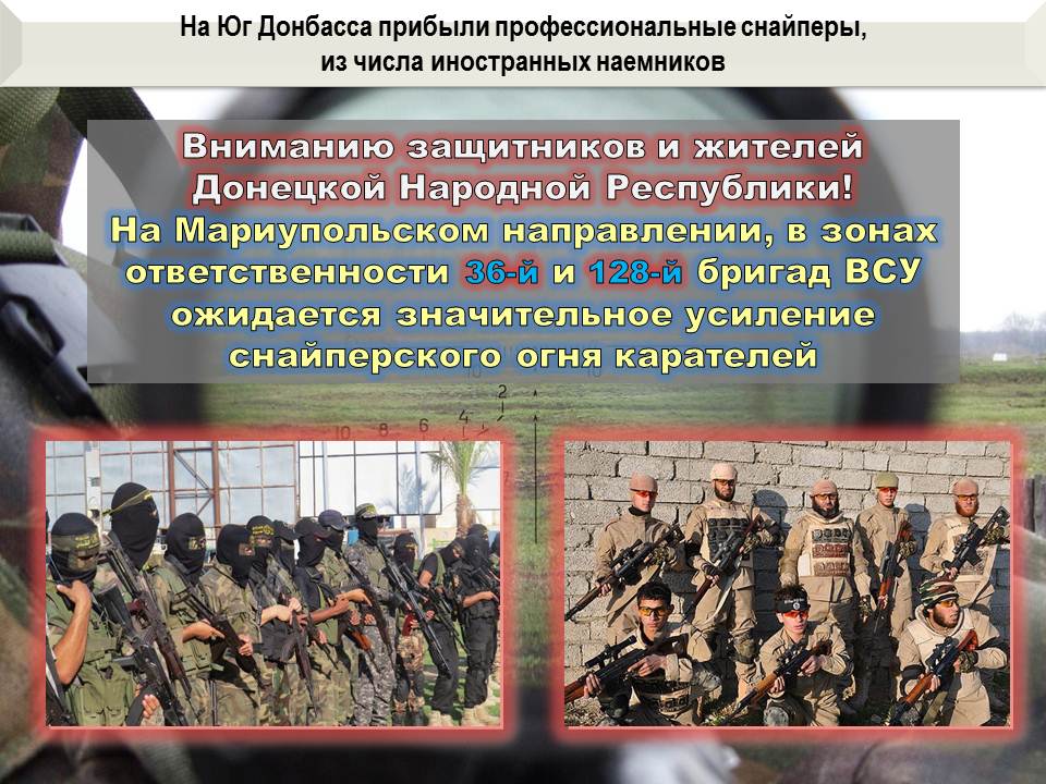 Мы прогнозируем увеличение количества фактов ведения снайперского огня по нашим позициям и мирным кварталам на Мариупольском направлении в зонах ответственности 36-й и 128-й бригады ВСУ.