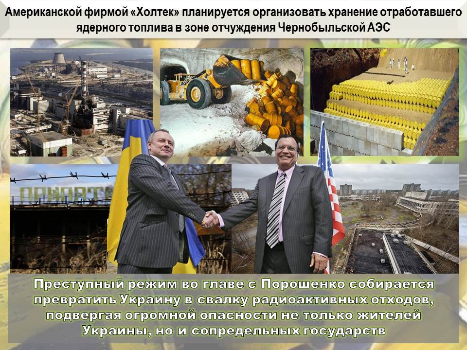 Под давлением Вашингтона, воры и преступники, захватившие власть в Киеве заключили соглашение на хранение в зоне отчуждения Чернобыльской АЭС отработанного ядерного топлива. Для этих целей американской фирмой «Холтек» заканчивается строительство специализированного хранилища. Ввод его в эксплуатацию намечен на 2019 год. В целом инфраструктура Чернобыльской АЭС находится в критическом состоянии. Киевский режим, неспособный самостоятельно решить имеющиеся проблемы, усугубляет ситуацию, создавая вокруг бывшей станции международные могильники ядерных отходов.