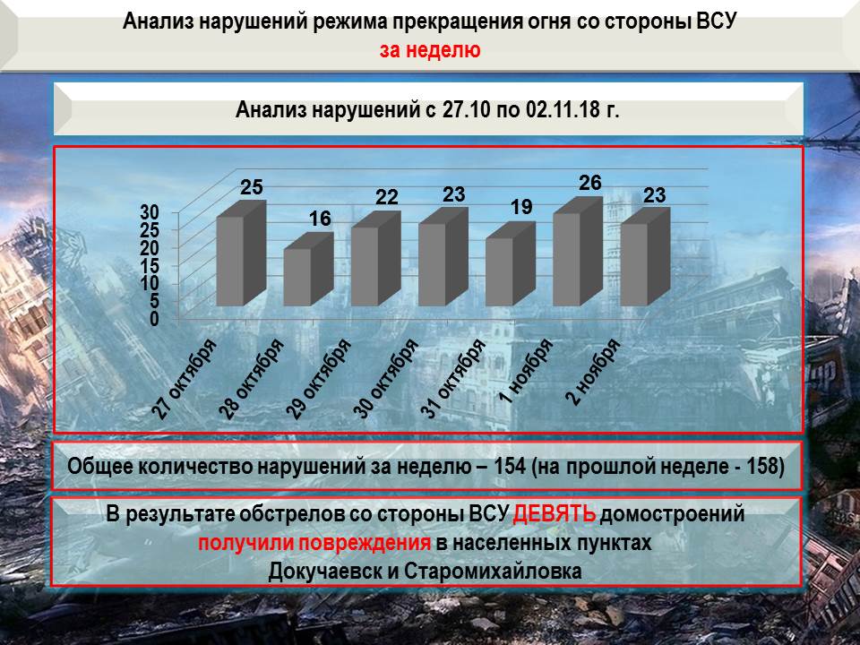Всего за неделю зафиксировано СТО ПЯТЬДЕСЯТ ЧЕТЫРЕ факта нарушения режима прекращения огня украинскими боевиками. По районам СЕМНАДЦАТИ населенных пунктов Республики противник выпустил СТО ПЯТЬДЕСЯТ ВОСЕМЬ мин калибром 120 и 82 мм, из которых СЕМЬДЕСЯТ СЕМЬ калибром 120 мм, также применял вооружение БМП, различные виды гранатометов, крупнокалиберные пулеметы и стрелковое оружие.