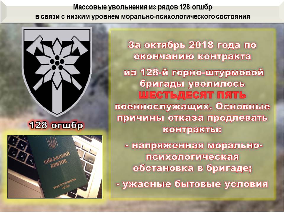 Отмечается снижение укомплектованности подразделений ВСУ в зоне ООС. Так, за октябрь 2018 года по окончанию контракта из 128-й горно-штурмовой бригады уволилось ШЕСТЬДЕСЯТ ПЯТЬ военнослужащих. Основными причинами отказа продлевать контракты являются напряженная морально-психологическая обстановка в бригаде и неудовлетворительные бытовые условия.