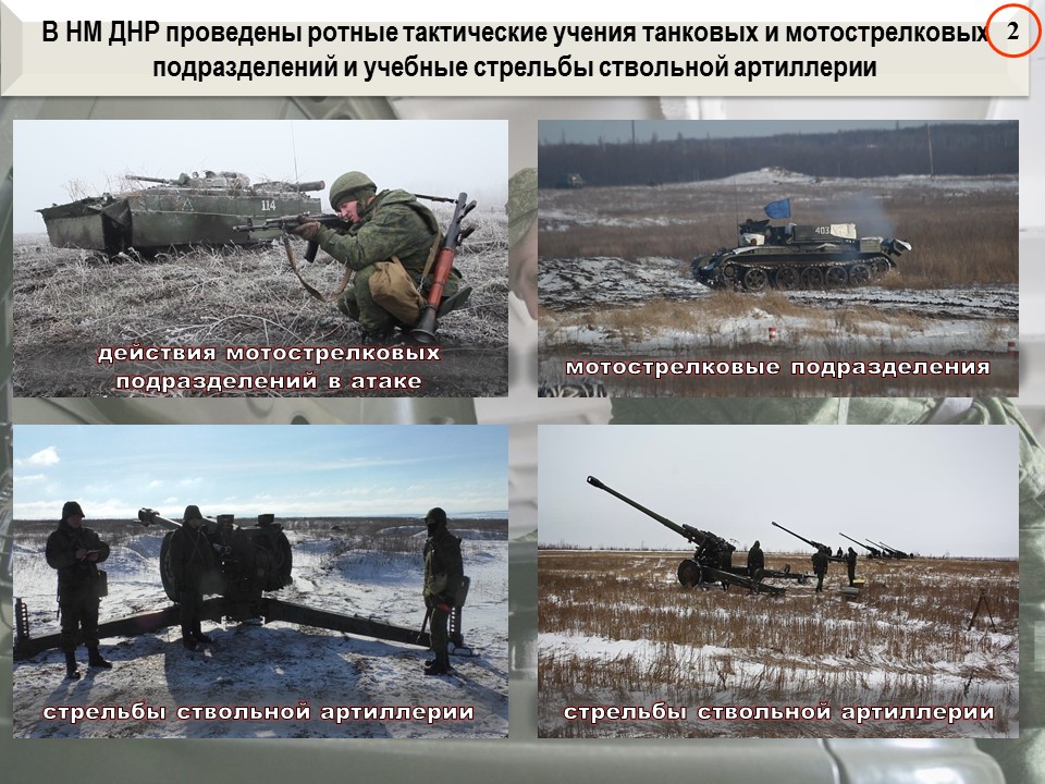 На текущей неделе в Народной милиции Донецкой Народной Республики проведены ротные тактические учения танковых и мотострелковых подразделений и учебные стрельбы ствольной артиллерии.