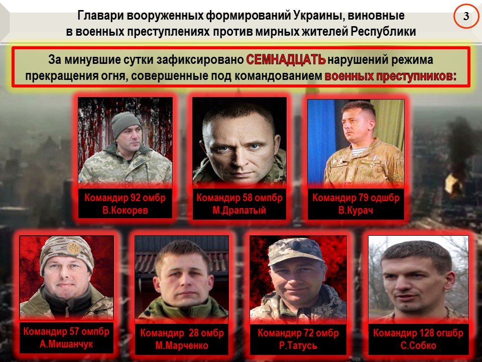 За минувшие сутки украинские оккупационные силы ВОСЕМНАДЦАТЬ раз нарушили режим прекращения огня. Обстрелам из 120-мм минометов, вооружения БМП, гранатометов, зенитных установок, крупнокалиберных пулеметов и стрелкового оружия подверглись населённые пункты Республики: ГОЛЬМОВСКИЙ, ЗАЙЦЕВО, ДОЛОМИТНОЕ, МИХАЙЛОВСКОЕ, посёлок шахты им. ГАГАРИНА, СПАРТАК, ЯСИНОВАТАЯ, КРУТАЯ БАЛКА, ВАСИЛЬЕВКА, КАШТАНОВОЕ, СТАРОМИХАЙЛОВКА, ЛЕНИНСКОЕ и район п. Трудовские г. ДОНЕЦКА.