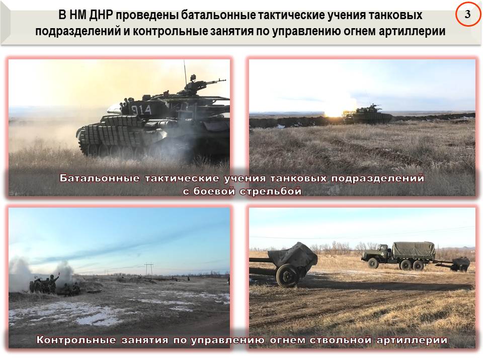 На текущей неделе в соединениях НМ ДНР прошли батальонные тактические учения танковых подразделений с боевой стрельбой и контрольные занятия по управлению огнем ствольной артиллерии.