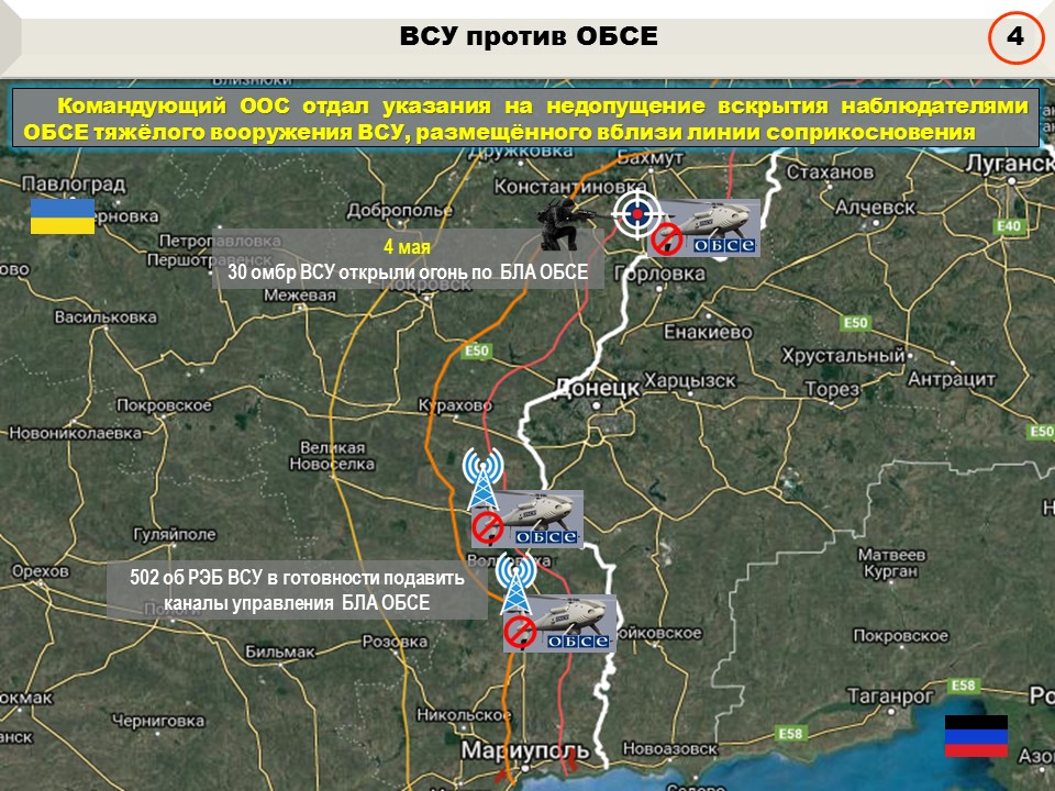 По указанию командующего оккупационными силами, украинские преступники с успехом продолжают борьбу с беспилотными летательными аппаратами миссии ОБСЕ с применением стрелкового оружия, что подтверждается в ежедневных отчётах наблюдателей. Так, 4 мая с целью недопущения обнаружения запрещённого вооружения, размещённого вблизи линии боевого соприкосновения, боевики из 30-й бригады открыли огонь по беспилотному летательному аппарату наблюдателей ОБСЕ малого радиуса действия неподалеку от н.п. Зайцево, чем в очередной раз вынудили их прекратить работу и приземлить аппарат.