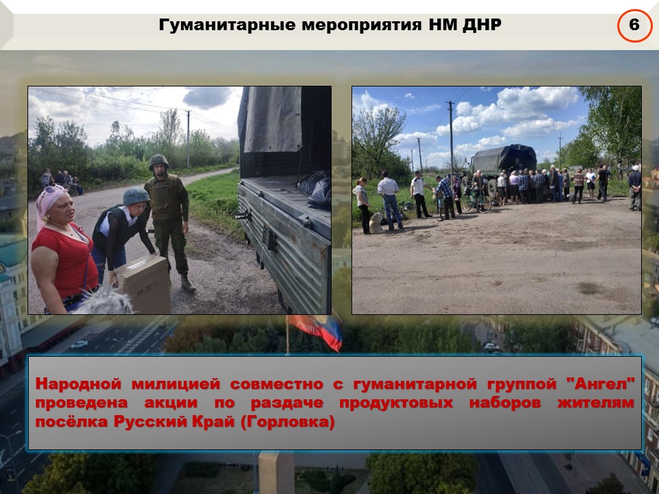 Народная милиция продолжает проводить мероприятия по оказанию помощи населению и социальным объектам Республики. На текущей неделе представители Народной милиции ДНР совместно с группой «Ангел» оказали гуманитарную помощь жителям посёлка Русский Край с передачей им продуктовых наборов.