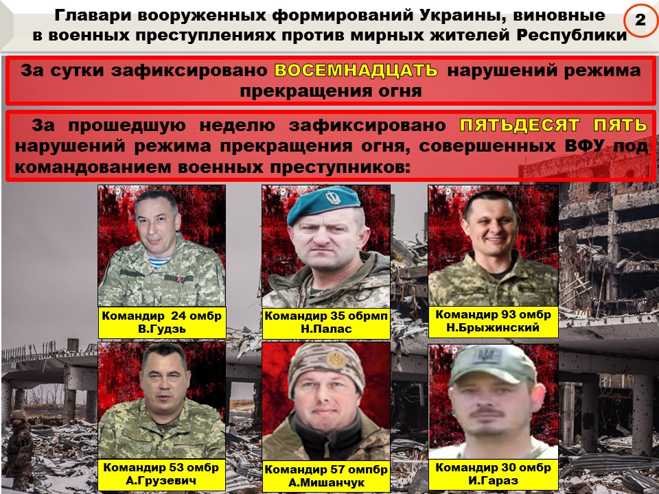 На Донецком направлении преступники из 35-й, 24-й и 57-й бригад под командованием ПАЛАСА, ГУДЗЯ и МИШАНЧУКА, обстреляли из гранатомётов, крупнокалиберных пулемётов и стрелкового оружия районы населенных пунктов ДОКУЧАЕВСК, АЛЕКСАНДРОВКА, СПАРТАК, ЖАБИЧЕВО, ЯКОВЛЕВКА, ВАСИЛЬЕВКА, ТРУДОВСКИЕ и район Донецкого аэропорта.