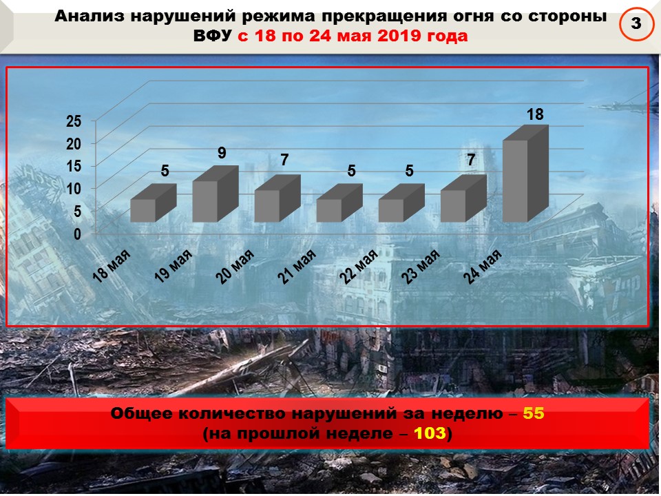 Всего за прошедшую неделю зафиксировано ПЯТЬДЕСЯТ ПЯТЬ обстрелов по районам ДЕВЯТНАДЦАТИ населённых пунктов Республики с применением артиллерии калибром 122 мм, 120 и 82-мм миномётов, ПТРК, вооружения БМП, гранатомётов, крупнокалиберных пулемётов и стрелкового оружия.