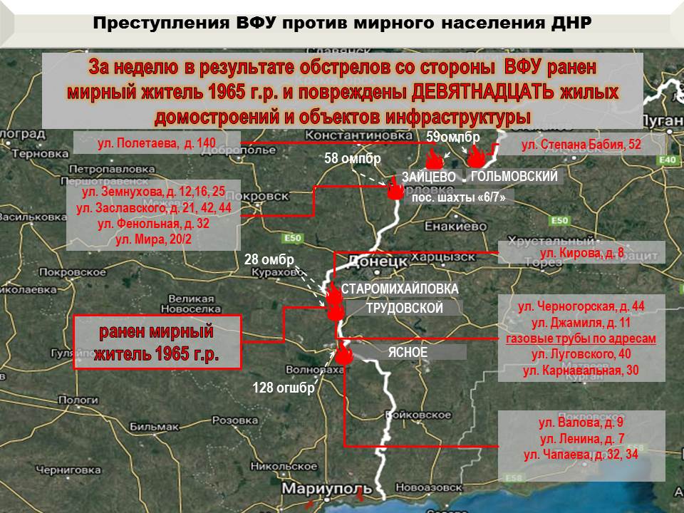 В результате обстрелов ВФУ ранения получил мирный житель 1965 года рождения и повреждено ДЕВЯТНАДЦАТЬ жилых домостроений и объектов инфраструктуры в населенных пунктах: ГОЛЬМОВСКИЙ, ЗАЙЦЕВО, СТАРОМИХАЙЛОВКА, ЯСНОЕ, посёлках шахт «6/7» г. ГОРЛОВКА и «Трудовская» г. ДОНЕЦК.