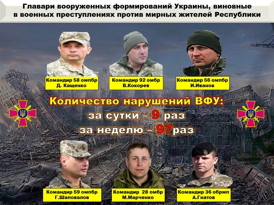 Все сведения с приложением фото и видеоматериалов направлены представителям международных организаций, находящихся в Республике, а также переданы в Генеральную прокуратуру для возбуждения уголовных дел в отношении военных преступников ШАПОВАЛОВА, ИВАНОВА, КАЩЕНКО, МАРЧЕНКО, КОКОРЕВА и ГНАТОВА.