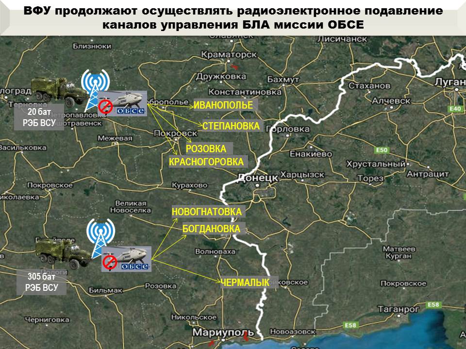 За прошедшую неделю нами выявлены многочисленные факты работы комплексов РЭБ «Буковель-АD» и Р-934Б из состава 20 и 305 батальонов РЭБ ВСУ. Работа осуществлялась в районах н.п. ЧЕРМАЛЫК, НОВОГНАТОВКА, БОГДАНОВКА, СТЕПАНОВКА, РОЗОВКА, ИВАНОПОЛЬЕ и КРАСНОГОРОВКА, где наблюдатели миссии ОБСЕ были вынуждены прекратить работу БЛА, из-за угрозы их потери.
