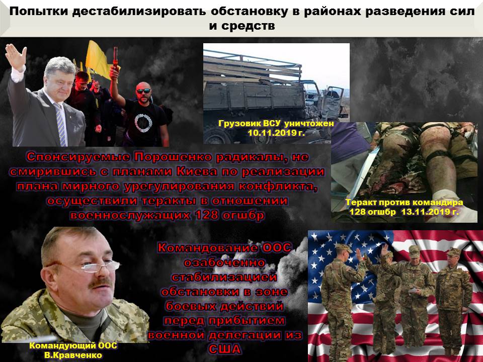 Прошедшая неделя характеризовалась обострением обстановки вдоль линии боевого соприкосновения на фоне процесса отвода сил и средств на участке БОГДАНОВКА - ПЕТРОВСКОЕ. Спонсируемые бывшим президентом Украины П.Порошенко националисты, не смогли смириться со стремлением официального Киева по реализации плана мирного урегулирования конфликта, дважды за неделю, в качестве мести, осуществили теракты в отношении военнослужащих 128 отдельной горно-штурмовой бригады. Первый случай произошел 10 ноября, когда радикалы обстреляли из гранатомета автомобиль «УРАЛ», в результате чего ЧЕТВЕРО военнослужащих получили ранения (двое позже скончались в госпитале). Второй случай вызвал более широкий общественный резонанс, в связи с тем, что целью террористов стал командир 128 бригады КОРОСТЕЛЕВ, который 13 ноября вместе с тремя офицерами осуществлял проверку новых позиций после отвода сил и средств в районе н.п. БОГДАНОВКА. В результате обстрела из АГС все четверо получили ранения, двое из них, включая командира находятся в тяжелом состоянии.