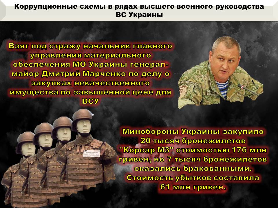 Р. Рябошапка заявил о взятии под стражу начальника главного управления материального обеспечения Министерства обороны Украины генерал-майора Дмитрия Марченко, который является главным подозреваемым в уголовном деле по факту закупки некачественного имущества по завышенной цене для ВСУ. В уголовном деле фигурирует еще 4 офицера Министерства обороны. Согласно имеющейся информации, Минобороны Украины закупило 20 тысяч бронежилетов "Корсар М3" стоимостью 176 млн гривен, но 7 тысяч бронежилетов оказались бракованными. Стоимость убытков составила более 60 млн гривен.