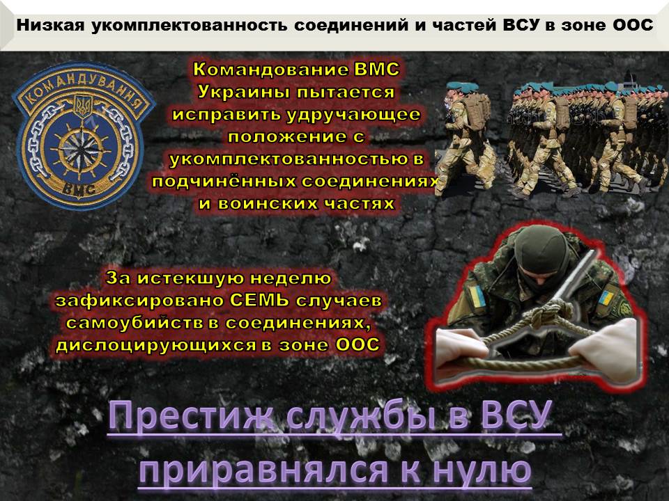 Продолжаем фиксировать кадровый некомплект в элитных частях ВСУ. Так, командованием морской пехоты ВМС Украины отданы указания командирам подчиненных соединений и частей совместно с представителями областных военных комиссариатов, в 2020 году провести доукомплектование подчинённых соединений и частей не менее 70 проц. от штатной численности. В этих целях, должностным лицам подчинённых соединений и частей приказано усилить агитационную работу с подчинёнными военнослужащими, с военнослужащими других воинских частей, с гражданским населением и военнослужащими оперативного резерва первой очереди. Таким образом, стремление командования доукомплектовать воинские части хотя бы до 70 проц. от штатной численности, наглядно демонстрирует удручающее положение дел в сфере кадров. Так, на сегодняшний день штатная численность 36 отдельной бригады морской пехоты составляет всего 52 процентов.