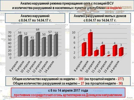 Всего за прошедшую неделю противник нарушил режим прекращения огня ТРИСТА ВОСЕМЬДЕСЯТ раз, и выпустил по территории Республики, из запрещенного Минскими договоренностями вооружения, 2672 снаряда и мины.