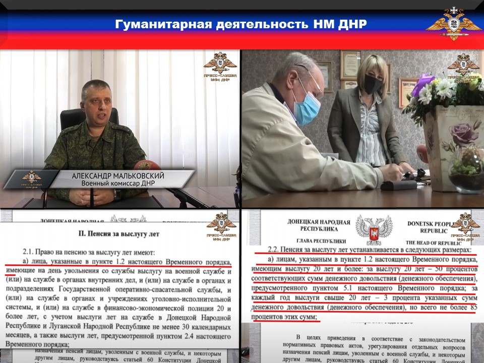 Кроме того, в Республике начаты мероприятия по исполнению вступившего в силу указа Главы Донецкой Народной Республики №374 от 27.12.2019 года «Об утверждении Временного порядка назначения пенсий лицам, уволенным с военной службы, и некоторым другим лицам и внесении изменений в Указ Главы Донецкой Народной Республики от 27 октября 2017 года № 290» и приказа начальника УНМ ДНР «Об утверждении Инструкции об организации работы по подготовке и предоставлению документов для назначения пенсий лицам, уволенным с военной службы, и членам их семей в органах и подразделениях Управления Народной милиции Донецкой Народной Республики», что позволит значительно повысить социальную защищённость бывших военнослужащих и ветеранов боевых действий.