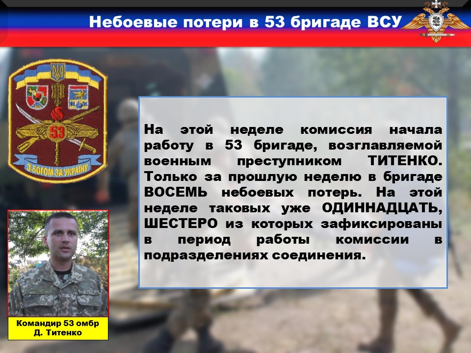 Как мы неоднократно заявляли, на этой неделе начала работу комиссия штаба ООС, цель которой выявить причины, приводящие к небоевым потерям ВФУ. На данный момент комиссия работает в 53 бригаде, возглавляемой военным преступником ТИТЕНКО. Только за прошлую неделю в бригаде ВОСЕМЬ небоевых потерь. На этой неделе таковых уже ОДИННАДЦАТЬ, ШЕСТЕРО из которых зафиксированы в период работы комиссии в подразделениях соединения.