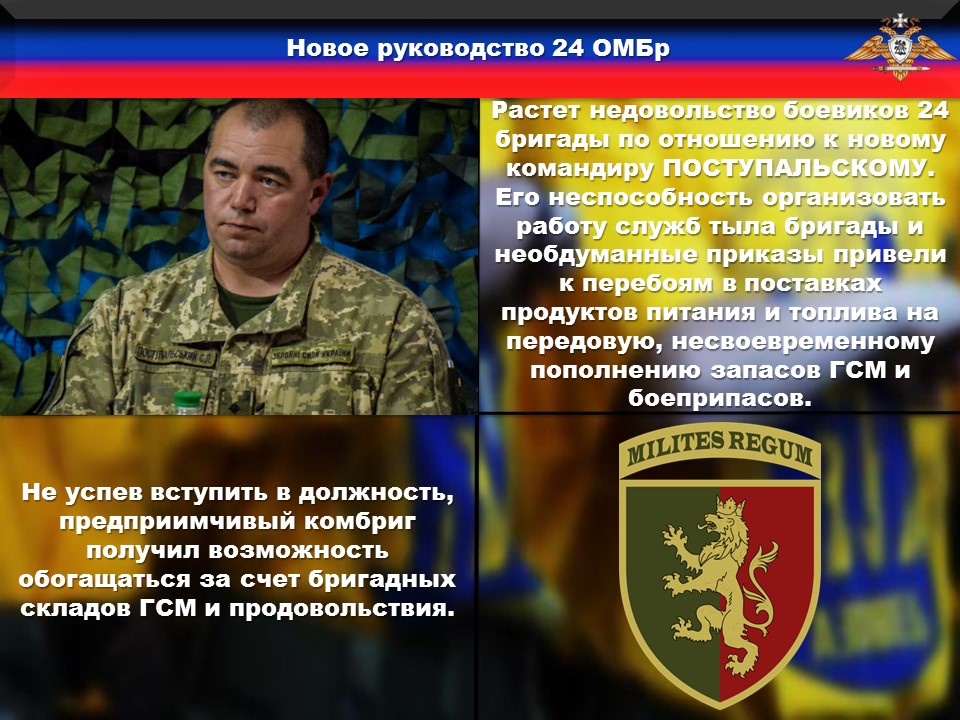 Растет недовольство боевиков 24 бригады по отношению к новому командиру ПОСТУПАЛЬСКОМУ. Его неспособность организовать работу служб тыла бригады и необдуманные приказы привели к перебоям в поставках продуктов питания и топлива на передовую, несвоевременному пополнению запасов ГСМ и боеприпасов.