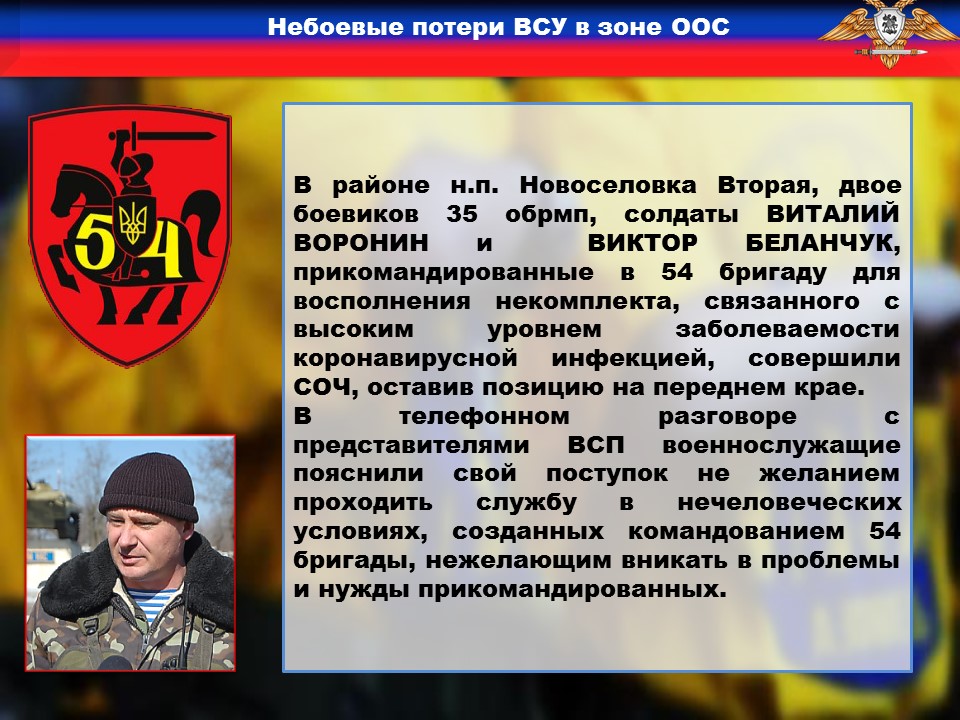 Не спокойная обстановка наблюдается и в 54 бригаде ВФУ под командованием МАЙСТРЕНКО. В районе н.п. Новоселовка Вторая, двое боевиков 35 обрмп, солдаты ВИТАЛИЙ ВОРОНИН и ВИКТОР БЕЛАНЧУК, прикомандированные в 54 бригаду для восполнения некомплекта, связанного с высоким уровнем заболеваемости коронавирусной инфекцией, совершили СОЧ, оставив позицию на переднем крае. В телефонном разговоре с представителями ВСП военнослужащие пояснили свой поступок не желанием проходить службу в нечеловеческих условиях, созданных командованием 54 бригады, нежелающим вникать в проблемы и нужды прикомандированных. По данному факту представителями восточного территориального управления ВСП проводится проверка с целью выяснения истинных причин данного преступления, военнослужащие объявлены в розыск.