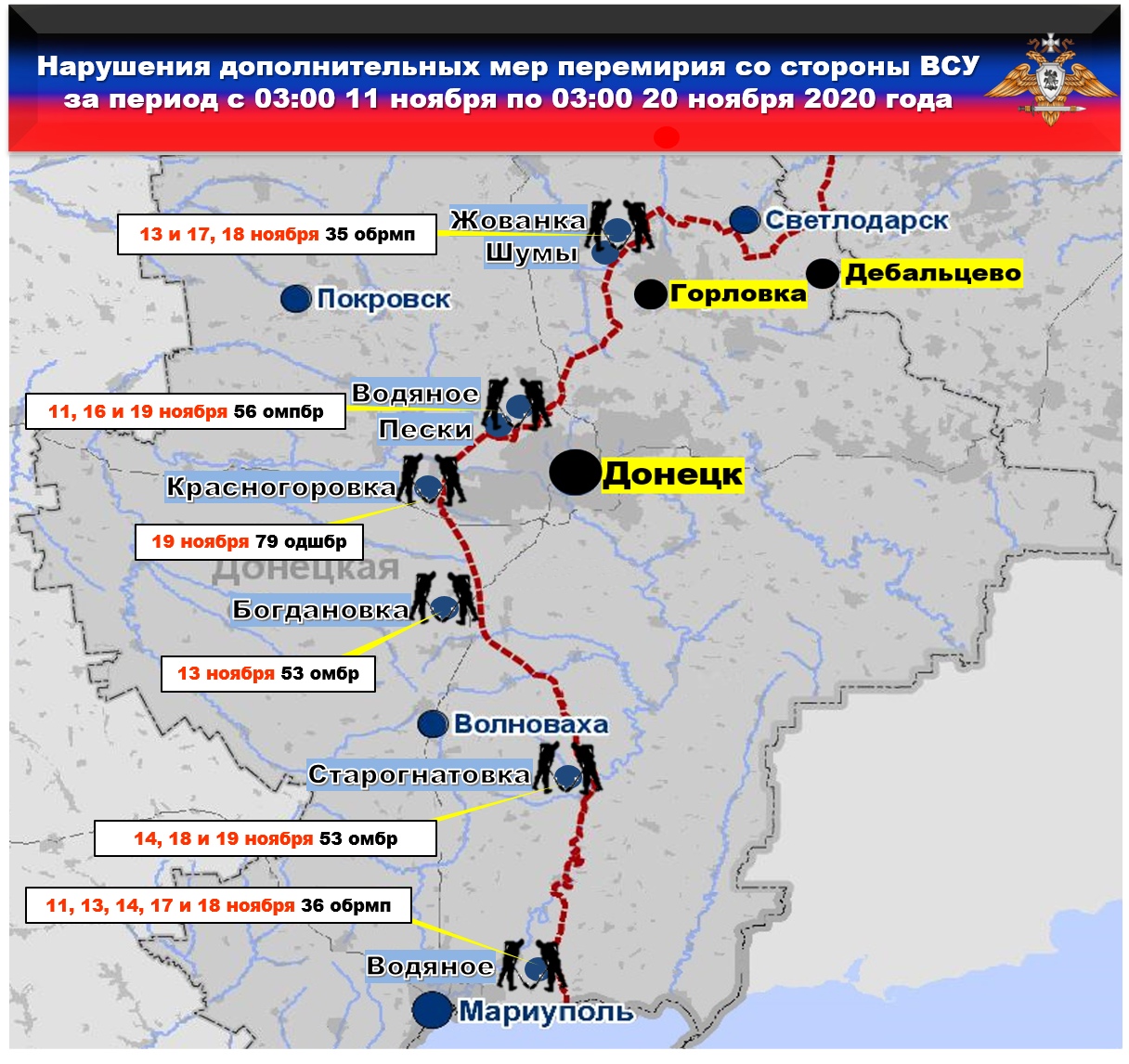 17 ноября – боевиками из состава 35 бригады в районе н.п. ЖОВАНКА и 36 бригады ДВАЖДЫ в районе н.п. ВОДЯНОЕ;