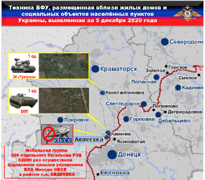 Также, с целью недопущения обнаружения БЛА СММ ОБСЕ запрещённого вооружения в зоне ответственности 72 омбр, в районе н.п. АВДЕЕВКА зафиксирована работа станции РЭБ «Букавель-АД» из состава мобильной группы 306 об РЭБ с целью подавления каналов управления и навигации БЛА Миссии ОБСЕ. Напомним, что 1 декабря текущего года, на одной из улиц н.п. АВДЕЕВКА беспилотником Миссии ОБСЕ были зафиксированы ДВЕ БМП из состава 72 бригады.