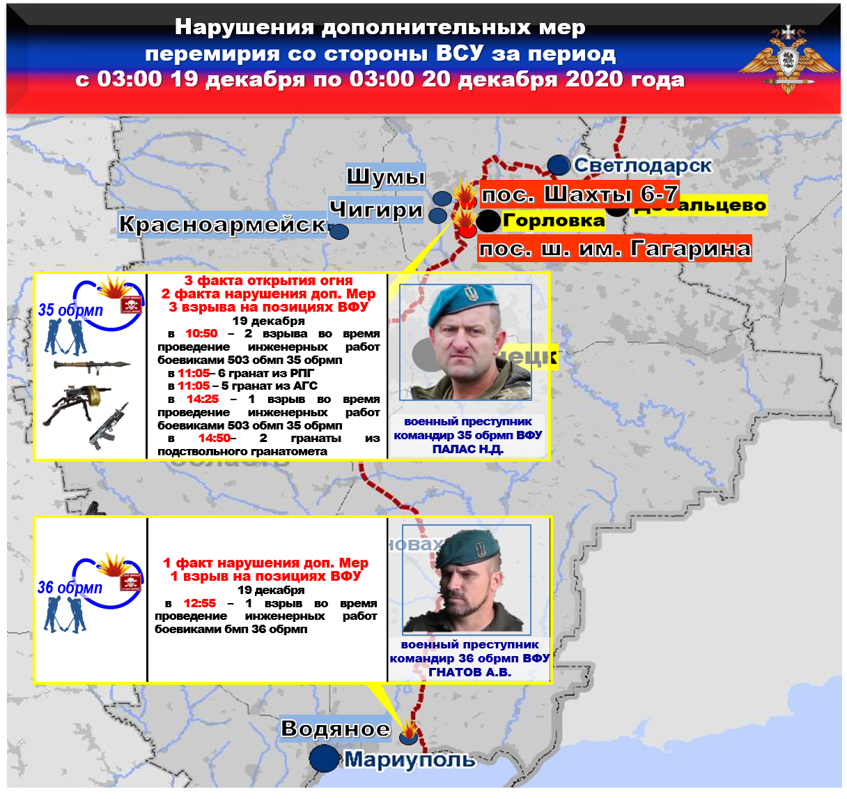 За истекшие сутки вооруженные формирования Украины совершили ТРИ огневые провокации, нарушив в общей сложности ШЕСТЬ раз Комплекс дополнительных мер по контролю за соблюдением перемирия.