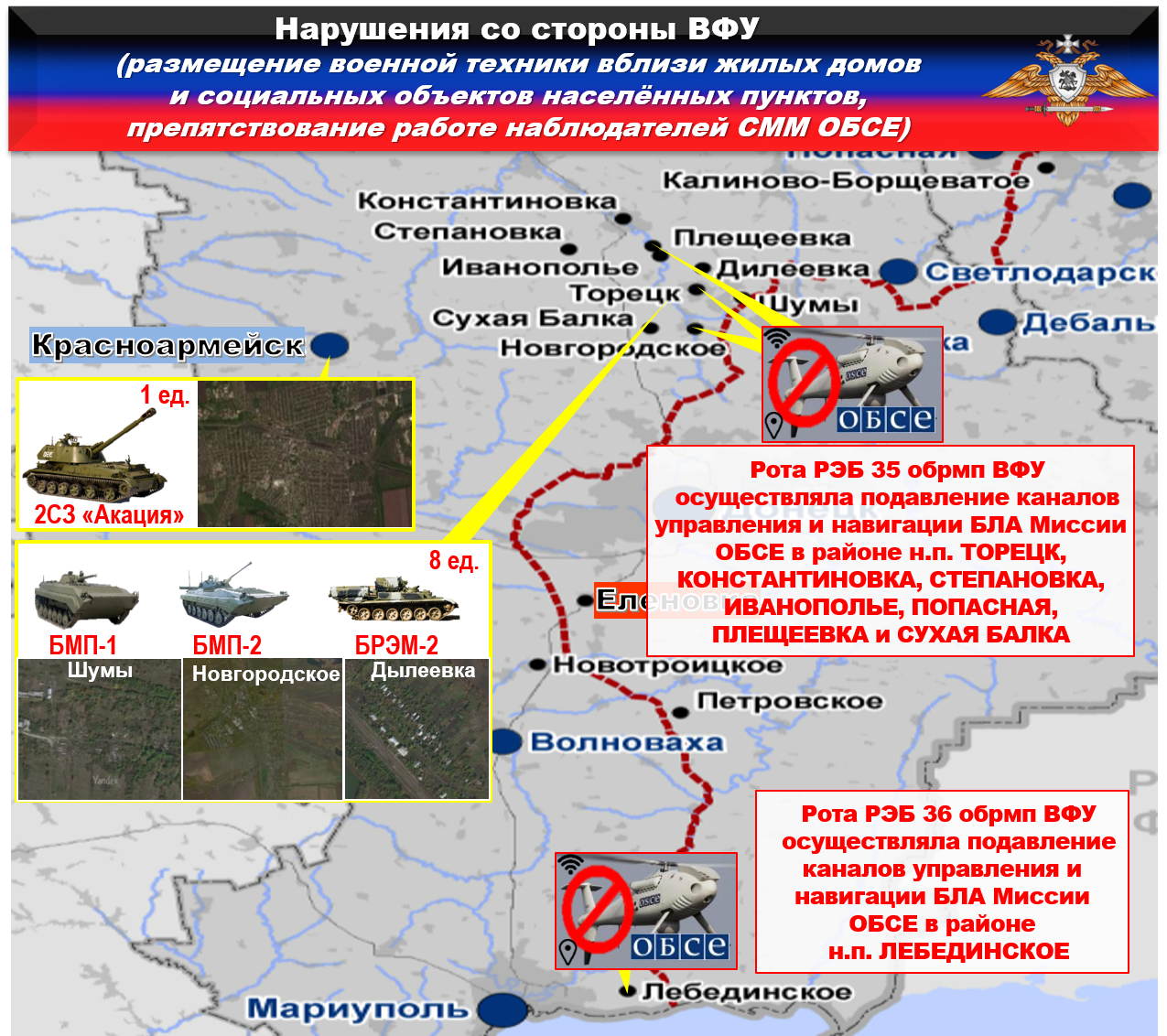Также, с целью недопущения обнаружения беспилотниками СММ ОБСЕ запрещенного вооружения в зоне ответственности 35 и 36 обрмп, зафиксировано применение в районах н.п. КОНСТАНТИНОВКА, ТОРЕЦК, СТЕПАНОВКА, ИВАНОПОЛЬЕ, ПОПАСНАЯ, ПЛЕЩЕЕВКА, СУХАЯ БАЛКА и ЛЕБЕДИНСКОЕ мобильных групп рот РЭБ 35 и 36 бригад ВФУ с задачей подавления станцией «Букавель-АД» каналов управления и навигации БпЛА миссии ОБСЕ.