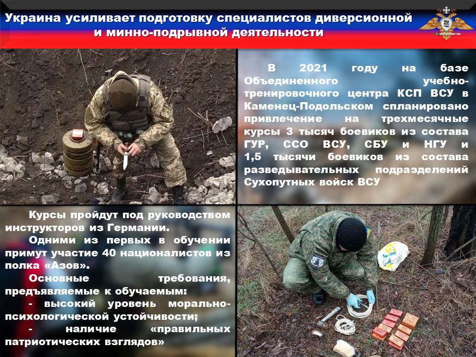 Так, по полученной информации, в 2021 году на базе Объединенного учебно-тренировочного центра Командования Сил поддержки ВСУ в КАМЕНЕЦ- ПОДОЛЬСКОМ Хмельницкой области спланировано привлечение на трехмесячные курсы 3 тысяч украинских боевиков из состава ГУР, ССО ВСУ, СБУ и НГУ по обучению проведения диверсий на военных и гражданских объектах. Кроме этого, в качестве эксперимента спланирована подготовка по упрощенной программе в течении 45 дней 1,5 тысячи украинских боевиков из состава разведывательных подразделений Сухопутных войск ВСУ.