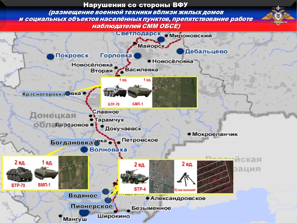 В нарушении ТРЕТЬЕГО пункта дополнительных мер, выявлено размещение ПЯТИ единиц вооружения и военной техники ВФУ вблизи жилых домов и муниципальных объектов на подконтрольной Украине территории.