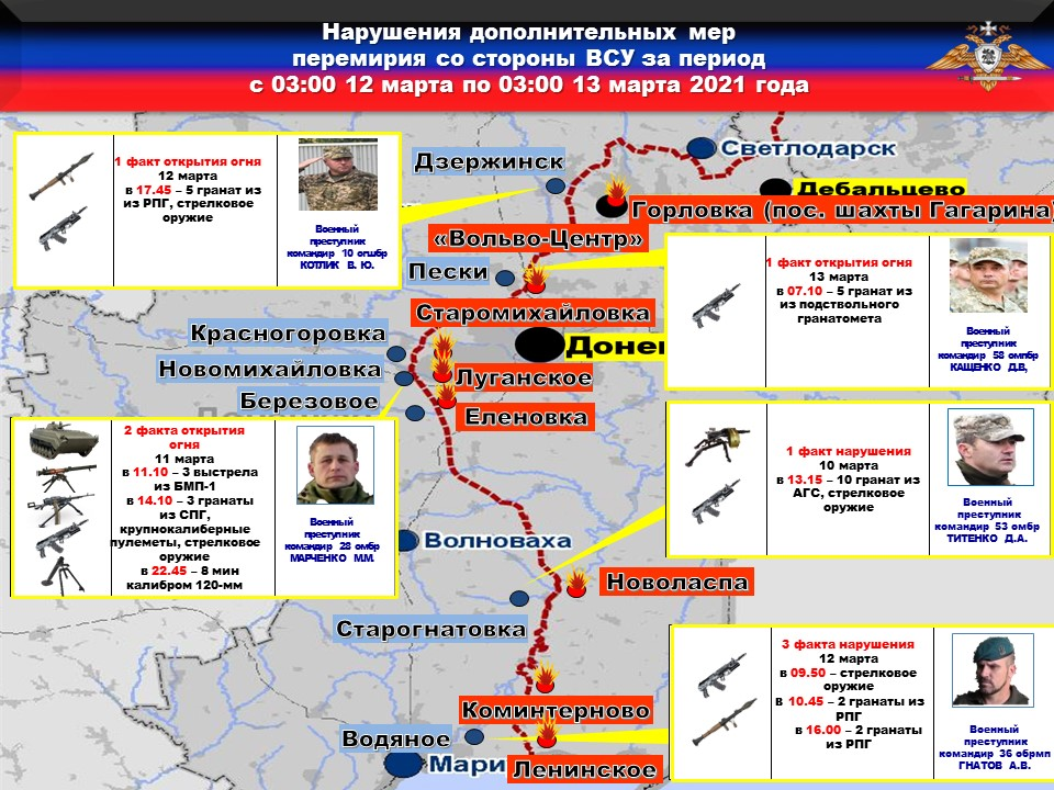 Факты нарушений в оперативном порядке доведены до представителей украинской стороны в СЦКК, с целью принятия мер к нарушителям и исключения случаев фальсификации учетных данных о нарушениях режима прекращения огня со стороны украинских боевиков.