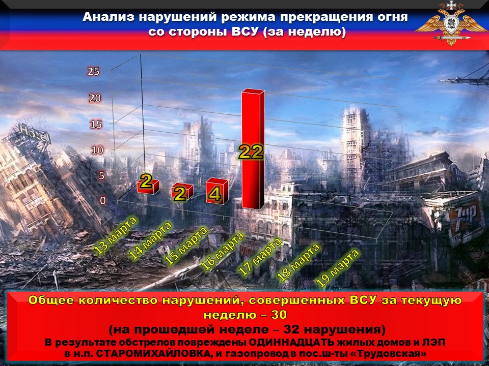 Невзирая на проведение очередного заседания Контактной группы, противник, в нарушение ВТОРОГО пункта дополнительных мер по контролю за соблюдением перемирия, усилил огневые провокации, совершив ДВАДЦАТЬ ОДИН обстрел территории нашей Республики.