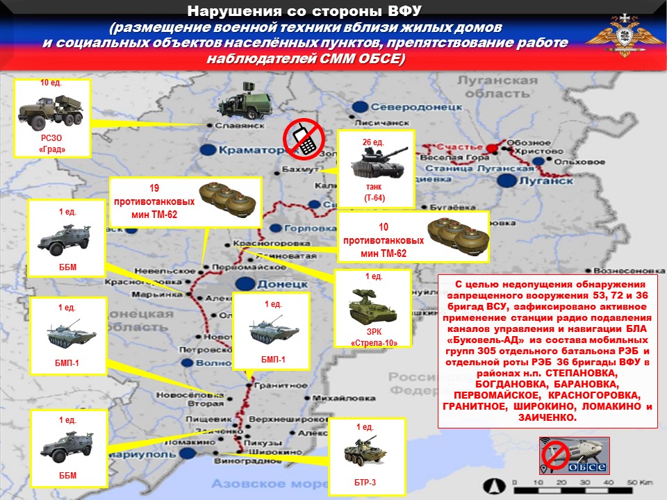В нарушение ТРЕТЬЕГО пункта дополнительных мер выявлено размещение СОРОКА ДВУХ единиц вооружения и военной техники ВФУ вблизи жилых домов и муниципальных объектов на подконтрольной Украине территории.