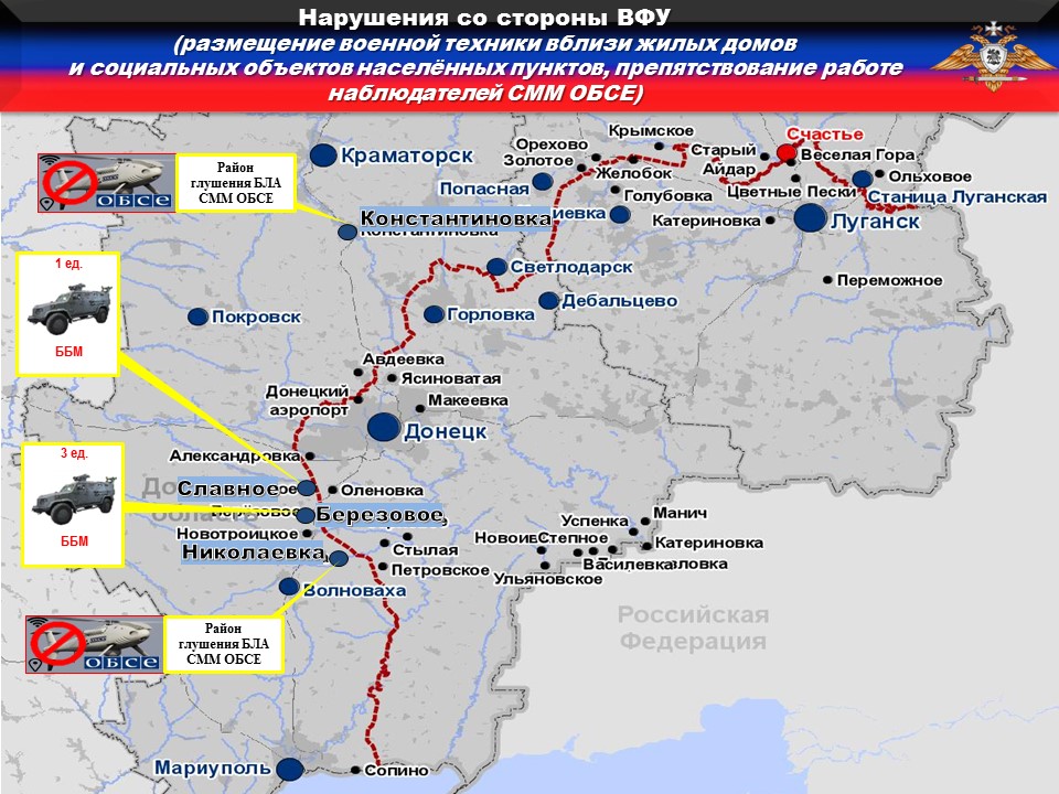 Украинская сторона продолжает препятствовать работе Международных наблюдателей, блокируя работу как наблюдательных патрулей, так и беспилотников СММ ОБСЕ. Так, после неоднократной фиксации наблюдателями СММ ОБСЕ запрещенного вооружения, находящегося на железнодорожной станции в н.п. КОНСТАНТИНОВКА, командование ООС отдало приказ на активное применение станции радиоэлектронного подавления каналов управления и навигации БЛА «Буковель-АД» из состава мобильной группы 305 отдельного батальона РЭБ вблизи станции погрузки, а также запрещать наблюдателям СММ ОБСЕ находится в зоне погрузки.
