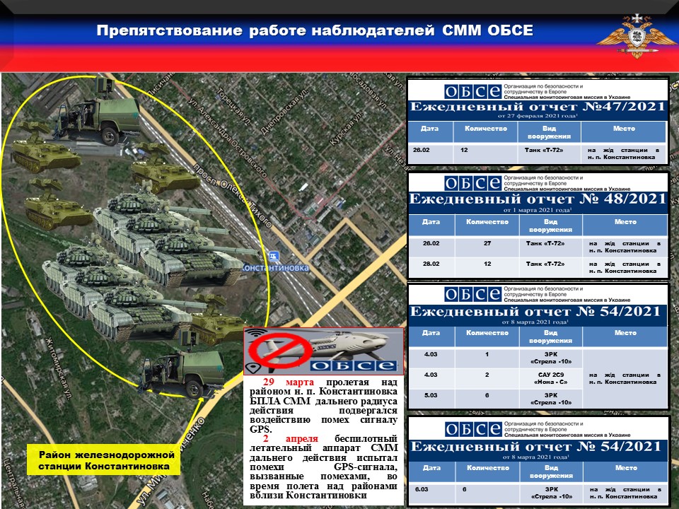 Только за март месяц, СММ ОБСЕ отмечалось нахождение на железнодорожной станции КОНСТАНТИНОВКА ШЕСТЬДЕСЯТ ШЕСТЬ единиц военного вооружения, из которых ПЯТЬДЕСЯТ ОДИН танк «Т-72», ДВЕ самоходные артиллерийские установки 2С9 «Нона-С» и ТРИНАДЦАТЬ зенитно-ракетных комплексов «Стрела-10».