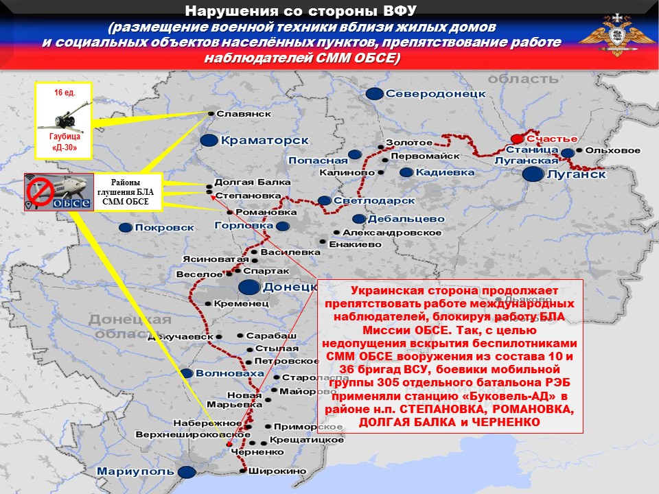 Украинская сторона продолжает препятствовать работе международных наблюдателей, блокируя работу БЛА Миссии ОБСЕ. Так, с целью недопущения вскрытия беспилотниками СММ ОБСЕ вооружения из состава 10 и 36 бригад ВСУ, боевики мобильной группы 305 отдельного батальона РЭБ применяли станцию «Буковель-АД» в районе ж\д станции н.п. СЛАВЯНСК и районах н.п. СТЕПАНОВКА, РОМАНОВКА, ДОЛГАЯ БАЛКА и ЧЕРНЕНКО