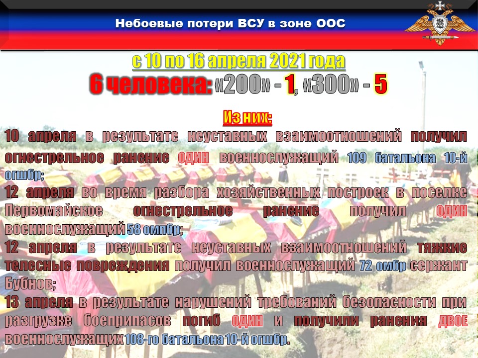 В период с 10 по 16 апреля в соединениях и частях ОТГ «Восток» небоевые потери составили ШЕСТЬ человек, ОДИН из которых безвозвратные: