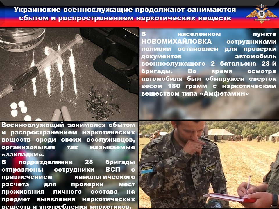 Вчера, в населенном пункте НОВОМИХАЙЛОВКА сотрудниками полиции остановлен для проверки документов автомобиль военнослужащего 2 батальона 28-й бригады. В ходе проверки документов сотрудники полиции задержали военнослужащего, который отказался предоставить документы и оказал им сопротивление. Во время осмотра автомобиля был обнаружен сверток весом 180 грамм с наркотическим веществом типа «Амфетамин». Военнослужащий передан сотрудникам военной службы правопорядка.