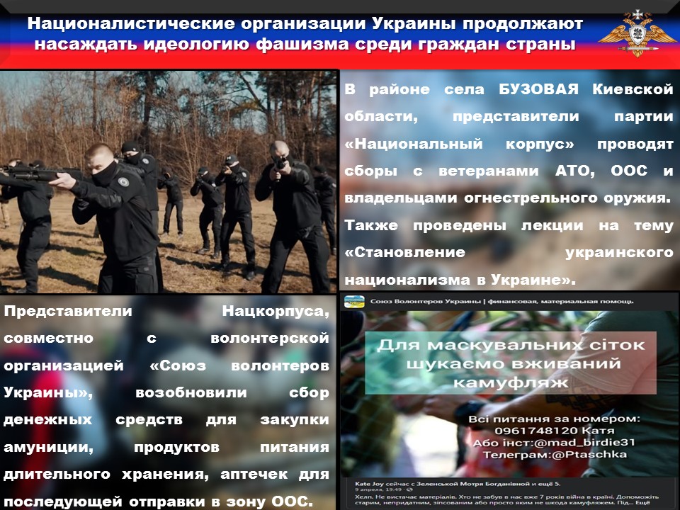 По имеющейся у нас информации в районе села БУЗОВАЯ Киевской области, представители партии «Национальный корпус» проводят сборы с ветеранами АТО, ООС и владельцами огнестрельного оружия, в ходе которых инструктора, из числа радикалов, обучают методам ведения боевых операций, в том числе и в условиях города, проводят занятия по физической, медицинской, огневой подготовке и подрывной деятельности. Также проведены лекции на тему «Становление украинского национализма в Украине».