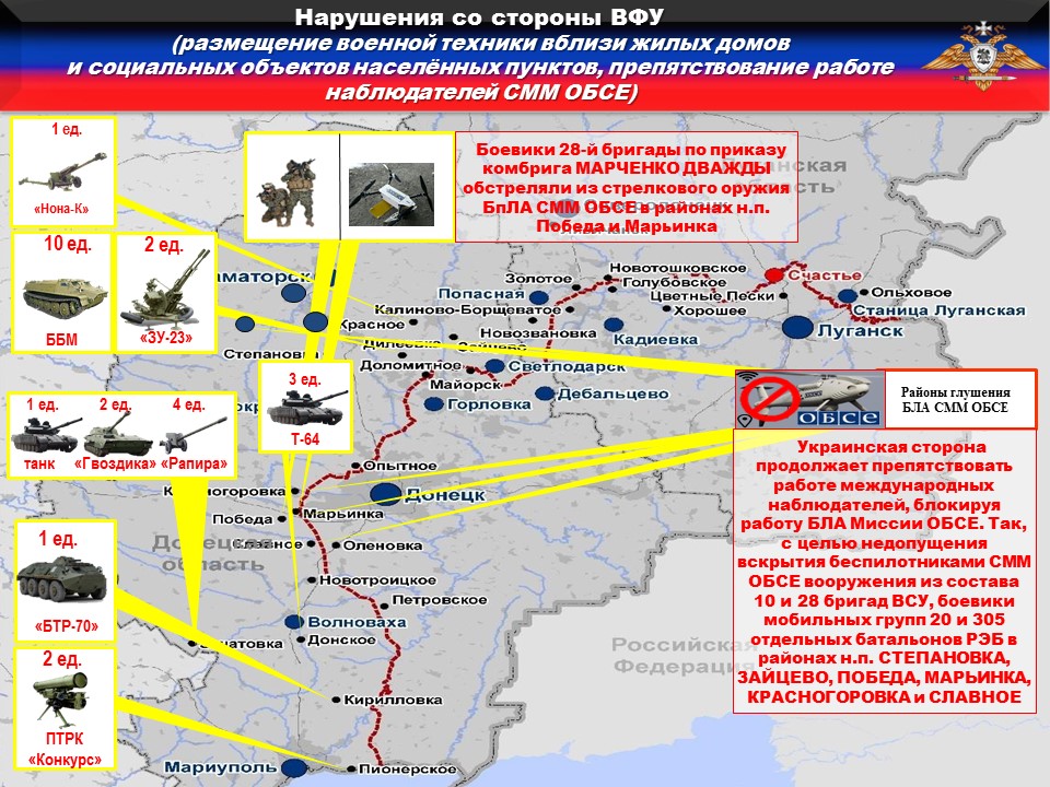 Украинская сторона продолжает активно препятствовать работе международных наблюдателей, блокируя работу БЛА Миссии ОБСЕ. Так, с целью недопущения вскрытия беспилотниками СММ ОБСЕ вооружения из состава 10 и 28 бригад ВСУ, боевики мобильных групп 20 и 305 отдельных батальонов РЭБ применяли станцию «Буковель-АД» в районах н.п. СТЕПАНОВКА, ЗАЙЦЕВО, ПОБЕДА, МАРЬИНКА, КРАСНОГОРОВКА и СЛАВНОЕ.