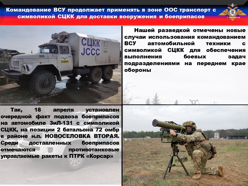 Так, 18 апреля установлен очередной факт подвоза боеприпасов на автомобиле ЗиЛ-131 с символикой СЦКК, на позиции 2 батальона 72 омбр в районе н.п. НОВОСЕЛОВКА ВТОРАЯ. Среди доставленных боеприпасов отмечаются противотанковые управляемые ракеты к ПТРК «Корсар».