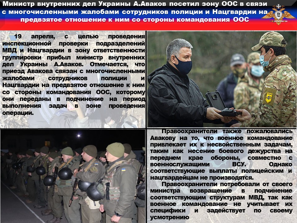 По информации нашего источника в штабе ОТГ «Восток», 19 апреля, с целью проведения инспекционной проверки подразделений МВД и Нацгвардии в зону ответственности группировки прибыл министр внутренних дел Украины А.Аваков. Отмечается, что приезд Авакова связан с многочисленными жалобами сотрудников полиции и Нацгвардии на предвзятое отношение к ним со стороны командования ООС, которому они переданы в подчинение на период выполнения задач в зоне проведения операции.