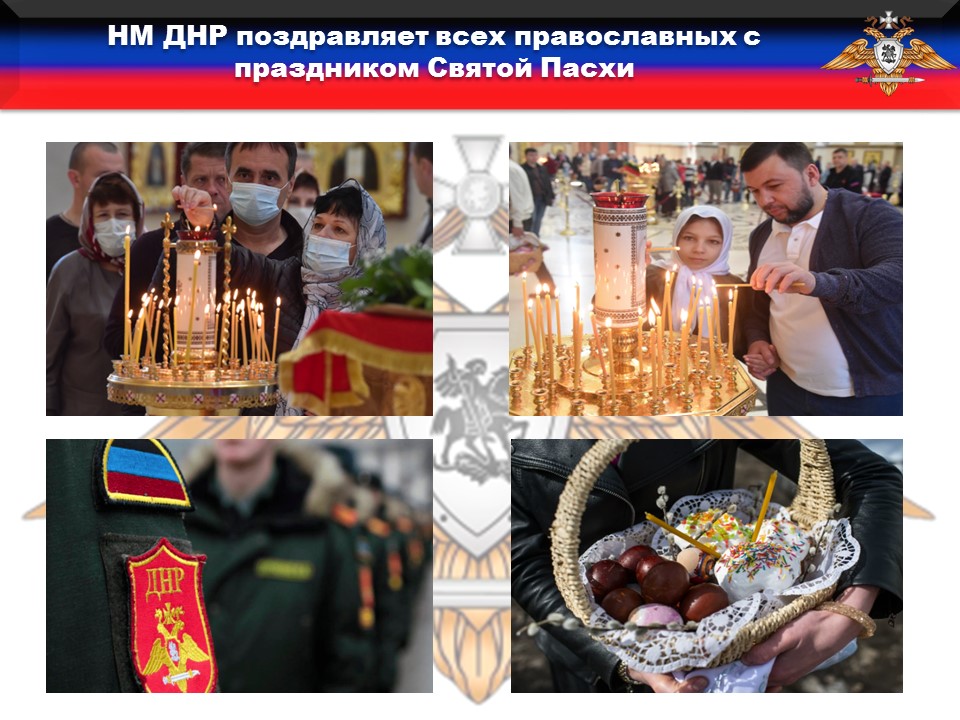 От командования Народной Милиции и от себя лично поздравляю православных христиан, военнослужащих и ветеранов. Широкое празднование светлого Христово Воскресения способствует укреплению духовных ценностей и традиции, сохраняет культурный облик нашего народа и дает неиссякаемый свет веры и надежды.